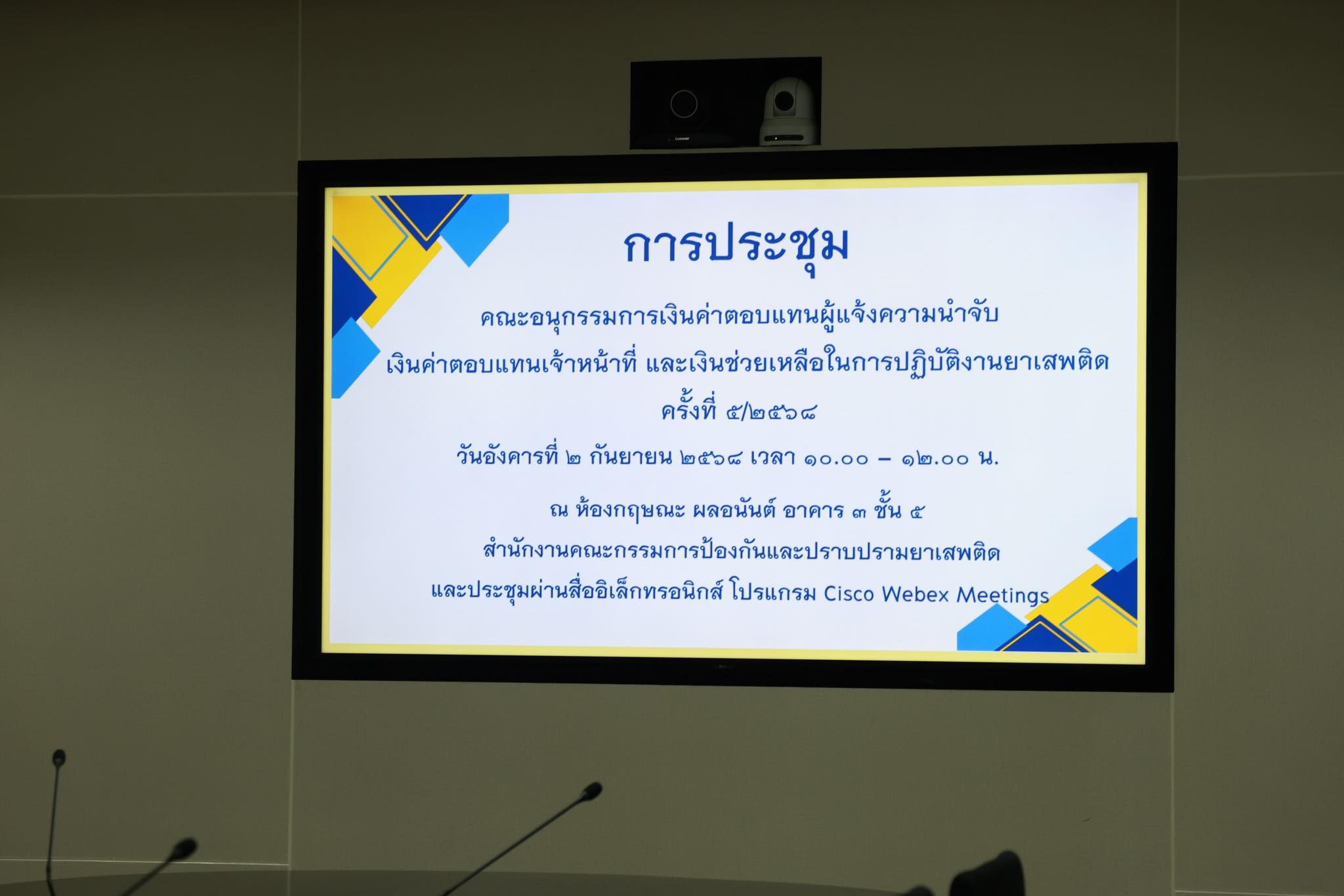 วันอังคารที่ 2 กันยายน 2568 เวลา 10.00 น. พลตำรวจโท ภาณุรัตน์ หลักบุญ เลขาธิการ ป.ป.ส. เป็นประธานการประชุมคณะอนุกรรมการเงินค่าตอบแทนผู้แจ้งความนำจับ เงินค่าตอบแทนเจ้าหน้าที่ และเงินช่วยเหลือในการปฏิบัติงานด้านยาเสพติด ครั้งที่ 5/2568 โดยมีผู้แทนจากสำนักงานอัยการสูงสุด สำนักงานตำรวจแห่งชาติ กรมการปกครอง สำนักงบประมาณ กรมบัญชีกลาง สำนักงานคณะกรรมการอาหารและยา และกรมศุลกากร เข้าร่วมประชุมในฐานะอนุกรรมการฯ ณ ห้องประชุมกฤษณะ อาคาร 3 ชั้น 2 สำนักงาน ป.ป.ส. พร้อมการประชุมผ่านสื่ออิเล็กทรอนิกส์ โปรแกรม Cisco Webex Meetings