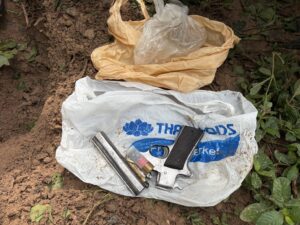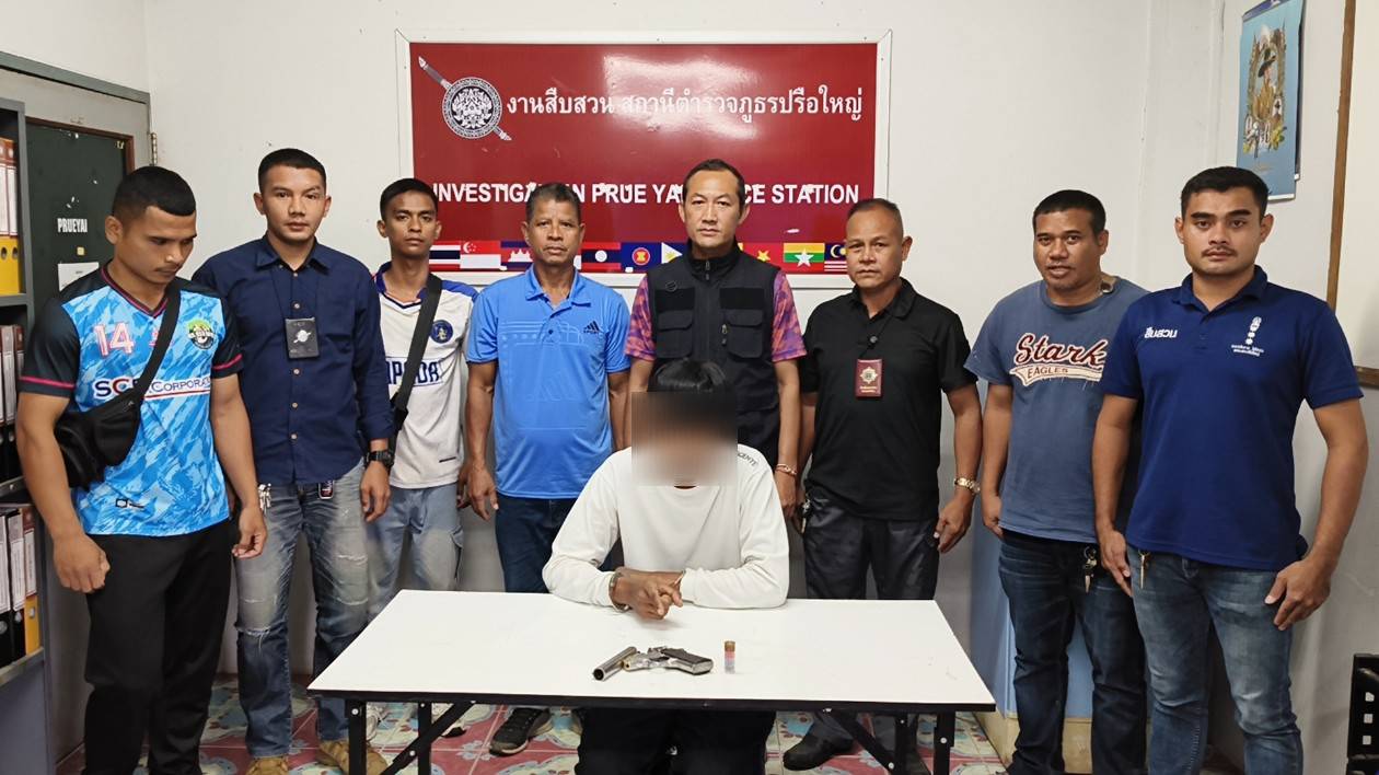 จากนั้น พ.ต.อ.อัครพล รัศมี ผกก.สภ.ปรือใหญ่ จึงได้สั่งการให้เจ้าหน้าที่ตำรวจชุดสืบสวน สภ.ปรือใหญ่ ลงพื้นที่ติดตามตัวผู้ก่อเหตุมาดำเนินคดี กระทั่งทราบตัวผู้ก่อเหตุ คือ นายประสพโชค ศรีสิงห์ หรือฟลุ๊ค อายุ 21 ปี ชาว ต.ละลม อ.ภูสิงห์ จ.ศรีสะเกษ จึงนำกำลังเข้าจับกุมตัวได้ที่บ้านหลังหนึ่ง ในพื้นที่ ต.หนองฉลอง อ.ขุขันธ์ จ.ศรีสะเกษ พร้อมนำชี้จุดซุกซ่อนอาวุธปืน ที่ขุดหลุมฝังไว้ใต้ดิน และนำโอ่งขนาดใหญ่มาปิดทับไว้ บริเวณข้างบ้านหลังดังกล่าว พบว่าเป็นอาวุธปืนลูกซองสั้น (ไทยประดิษฐ์) จำนวน 1 กระบอก พร้อมเครื่องกระสุนปืน ขนาด เบอร์ 12 จำนวน 1 นัด จึงทำการตรวจยึดไว้เป็นหลักฐาน